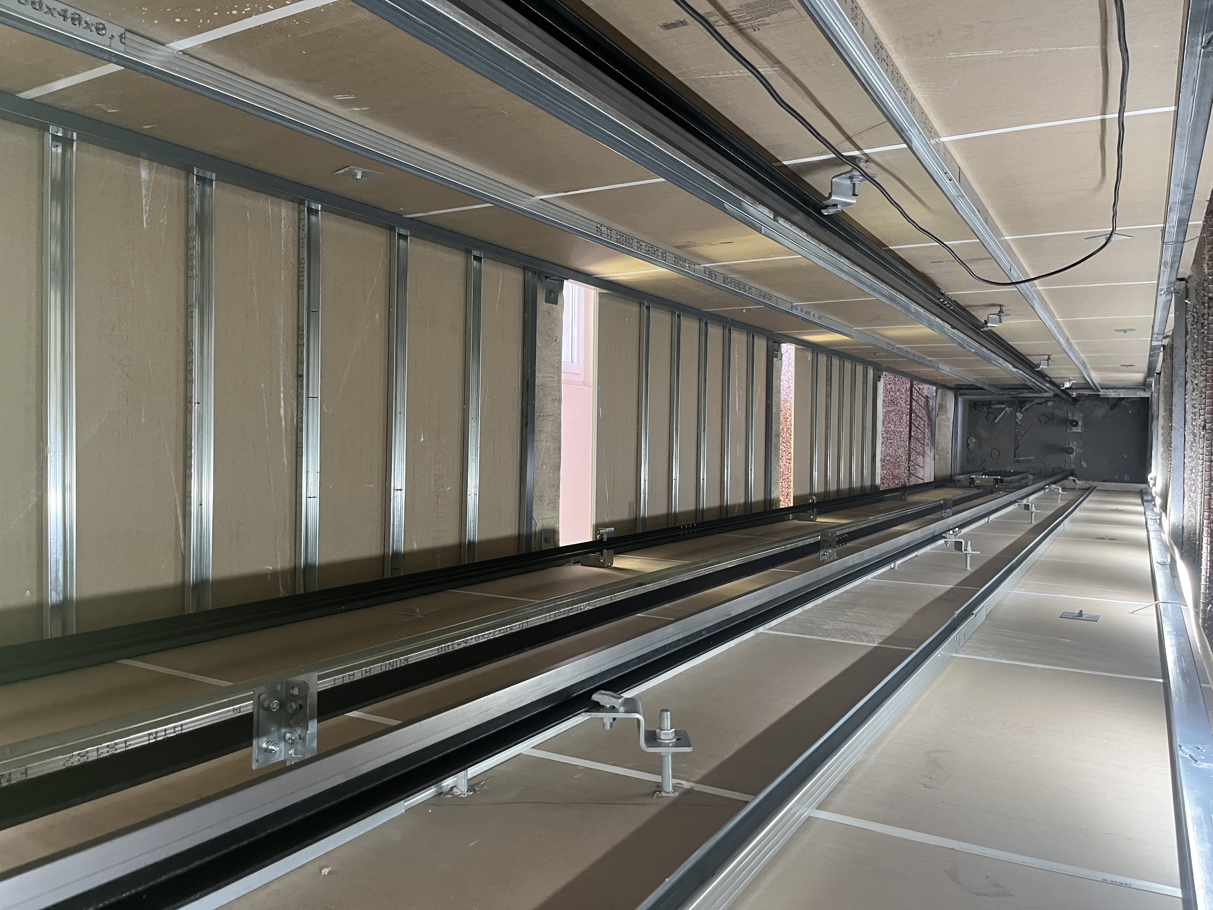 neprůchozí kabinu výtahu jsme nahradili kabinou průchozí. Kolem šachty podél
