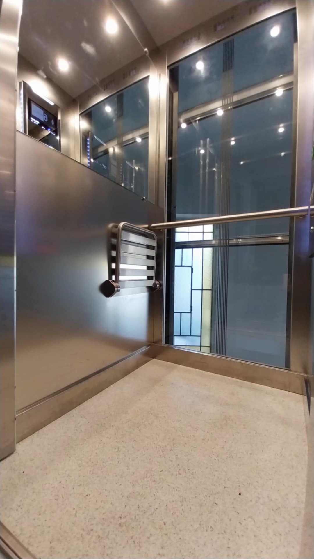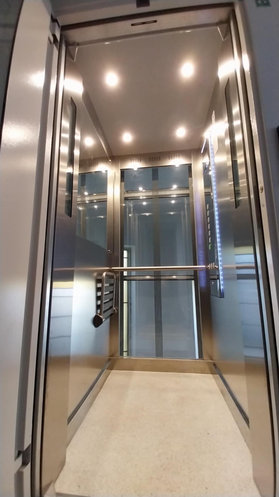 Kabina výtahu je nerezová a má prosklenou zadní stěnu,