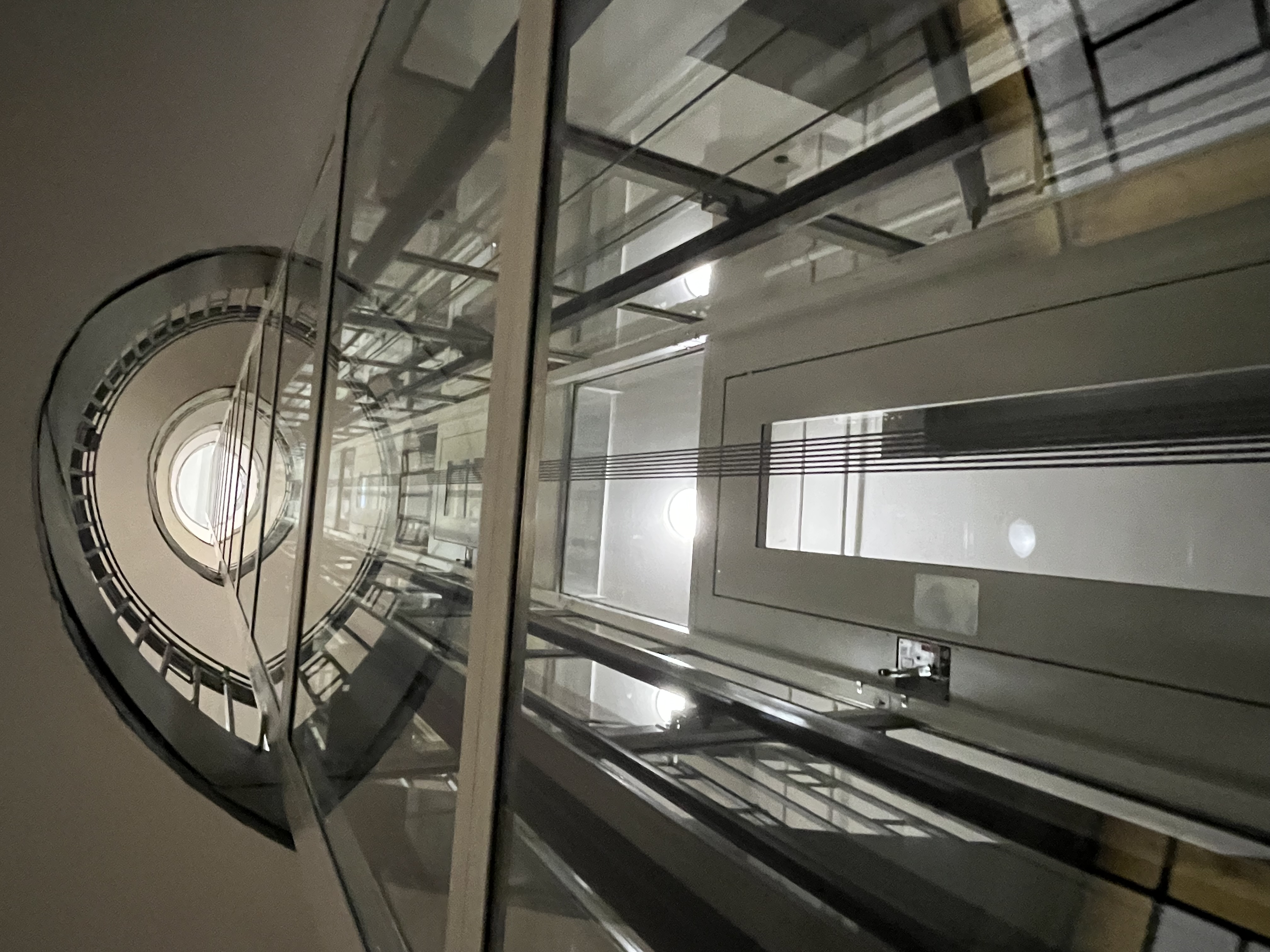 takže při jízdě lze vidět skrz na původní schodiště – zajímavý vizuální