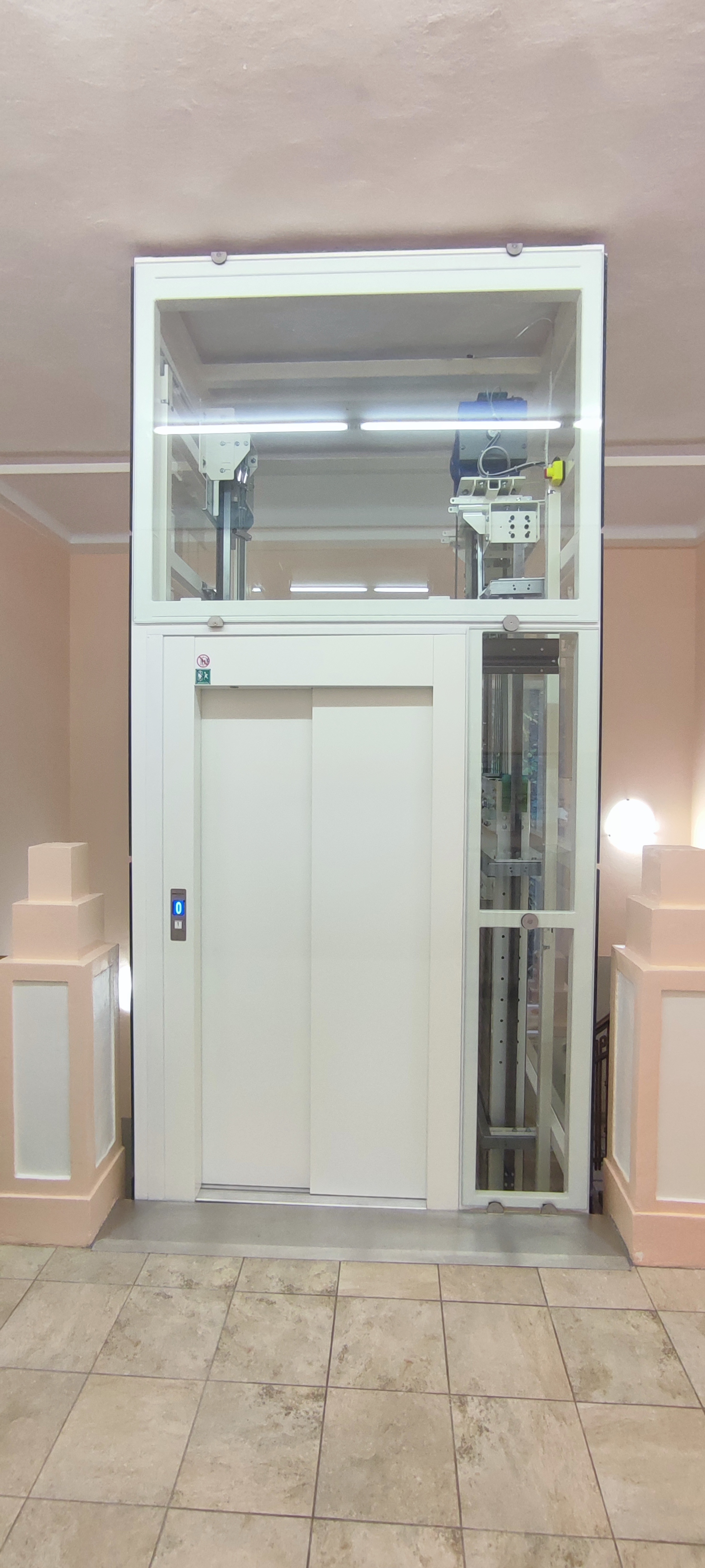 Do šachty jsme osadili neprůchozí výtahovou kabinu s nosností 630 kg, splňující veškeré požadavky na bezbariérovost. Kabina je vybavena madlem, sklopnou sedačkou a zrcadlem, samozřejmostí jsou automatické dveře. Výtah je určen především pro veřejnost, protože samotná knihovna se nachází v horním patře budovy.